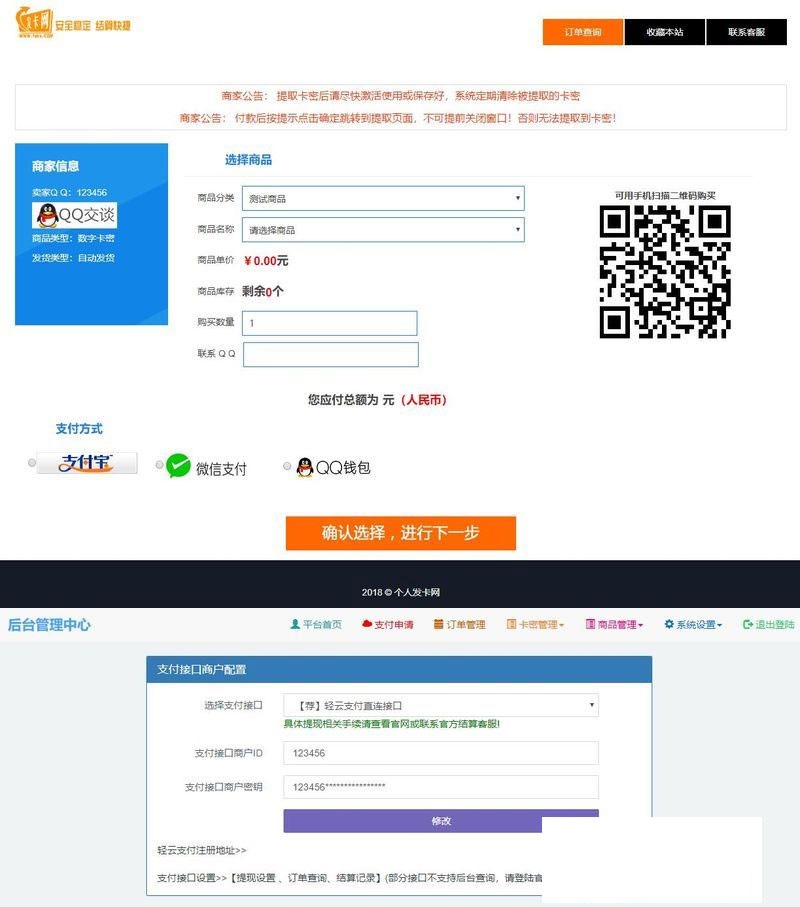 这款发卡网源码已经集成了码支付和轻云支付接口,并且有4个前台样式模板,当然如果你都不满意,可以自己写样式,毕竟这款发卡平台源码无加密无授权。