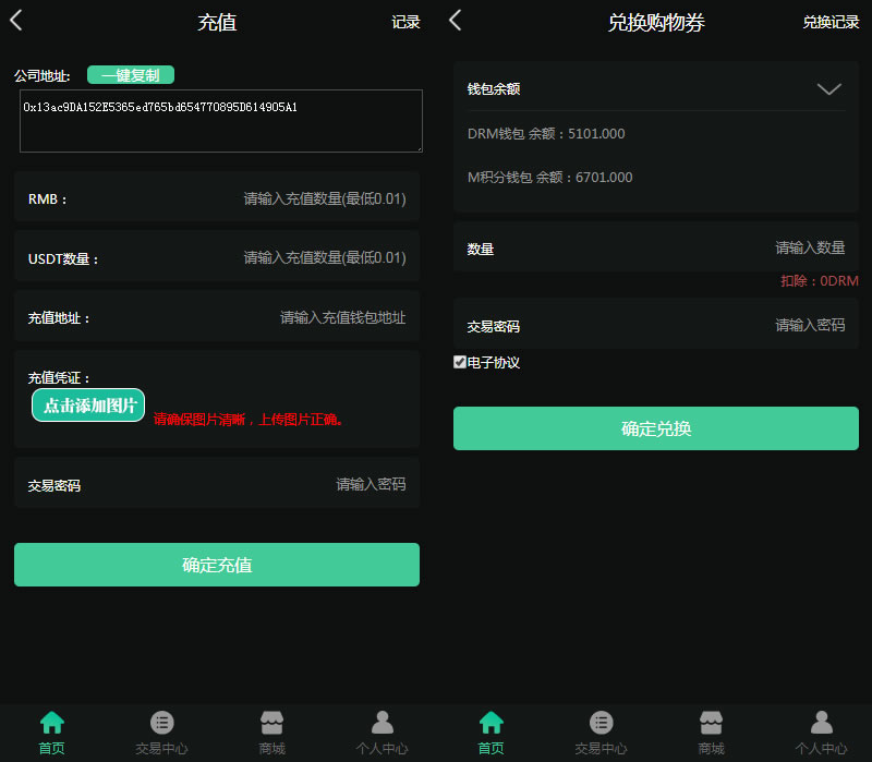 DRM森林 参与者通过USDt充值兑换梦想积分DRM,在平台使用DRM兑换购物券,并进入梦想体系,获得分红权益。购物券在商城可兑换等值产品。