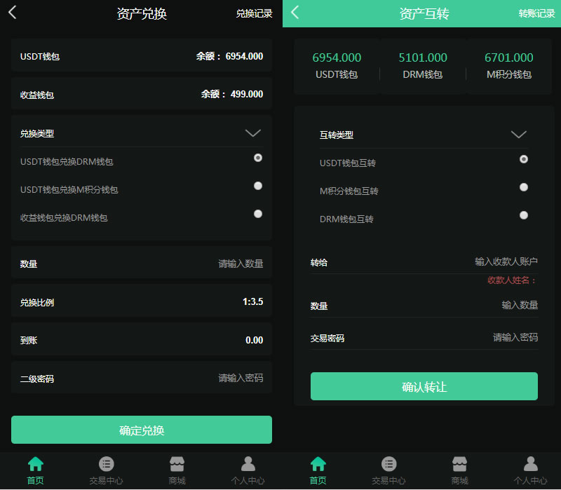 1.入场:USDT转账→上传凭证→审核获得相对应资产→USDT兑换DRM→成功入场获得与投资额等额的产品购