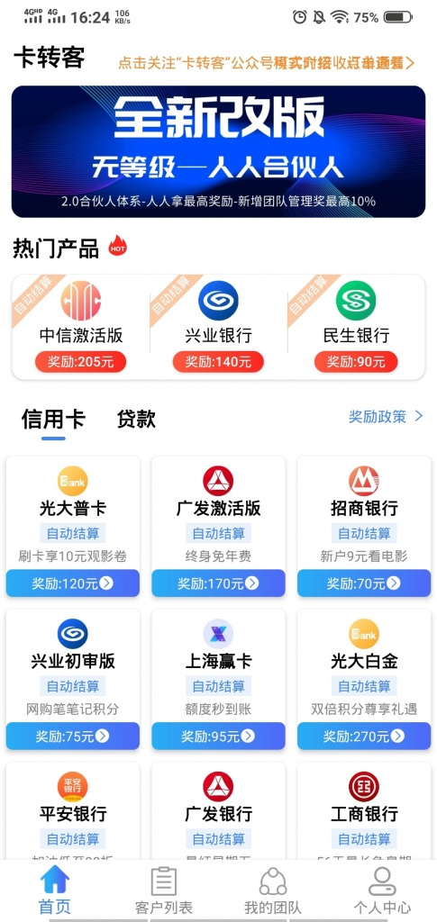 卡转客为国内领先的移动金融推广平台,现已成功和浦发银行、兴业银行、民生银行、光大银行等10余家国有股份制银行,宜人贷、拍拍贷、360借条、玖富等多家知名互联网金融公司达成战略合作。我们将接续秉承开放、共赢理念为卡转客用户提供多角度、全方位服务,助理卡转客用户开启创业之旅。
