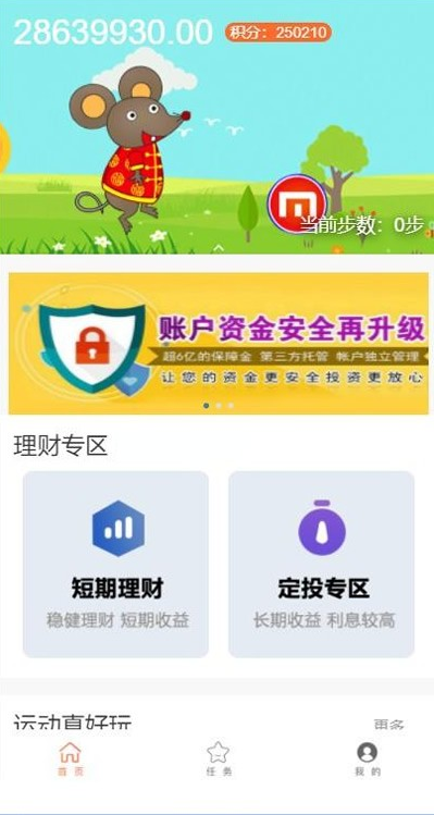 袋鼠理财投资,本程序流程有记步慢跑功能,余额宝功能,早起打卡,积分商场,抽奖活动作用等各层面为一体的综合性投资理财产品。