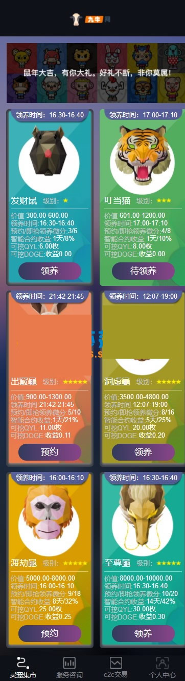 1.宠物共分4个种类,每个种类的价值、合约收益、合约周期、喂养时间、喂养饵料消耗都不同。