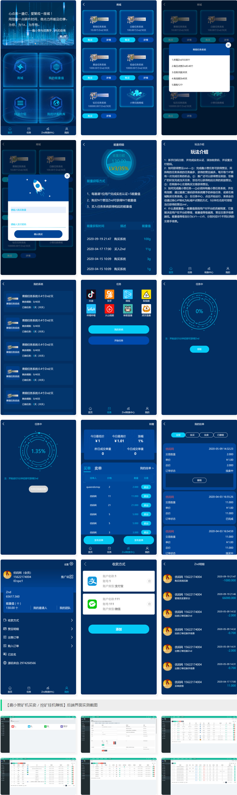 这个UI界面不错,看着应该和矿机差不多吧。有商城、挂机任务、虚拟币交易。