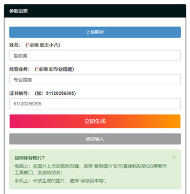 自带BGM、自适应手机端、支持上传证件照裁剪、ajax无刷新加载一键生成、无需等待,可以拿来改成其他生成也很方便。另附一个软著证书模板、