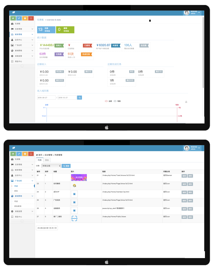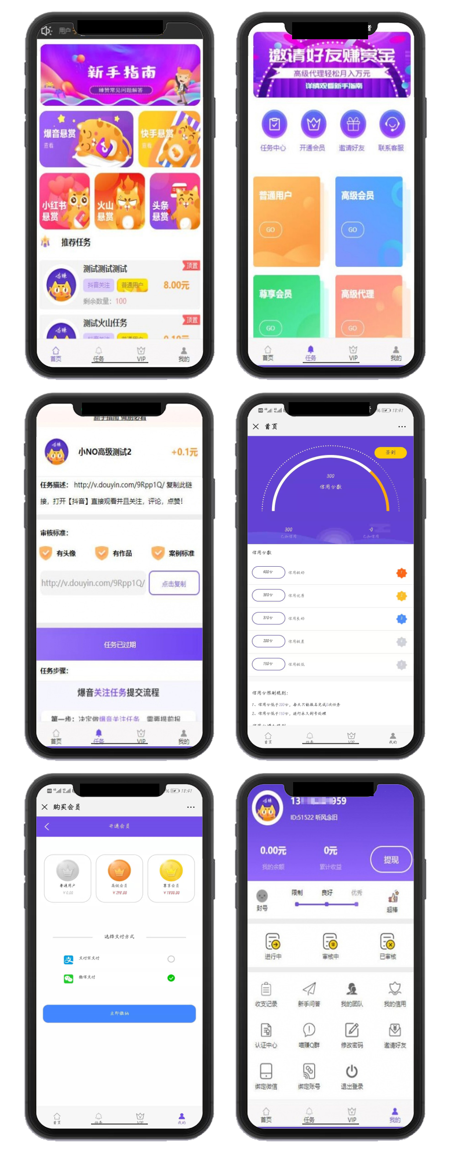 抖音点赞、关注,帮助短视频网红们提高人气,后台发布关注点赞任务,然后会员接单,完成有佣金,不同级别的会员每天接的数量不一样,带三级分佣推广系统首页任务接单,主要分为抖音和快手任务关注点赞,用户可以领取符合要求的任务,复制任务打开app关注和点赞,截图提交,后台审核通过后即可领取佣金,根据不同的等级每天领取的任务个数和单价都不一样,后台设置,还可以通过海报推广好友,获取推广的返佣,同时还可以领取推广下线的任务返利。此版本为单用户版。