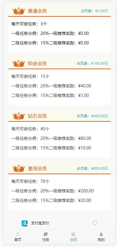 3、完整的会员制度。(璀璨钻石、钻石、黄金、白银、青铜、)以此类推(后台都可设置任务数量,会员费)