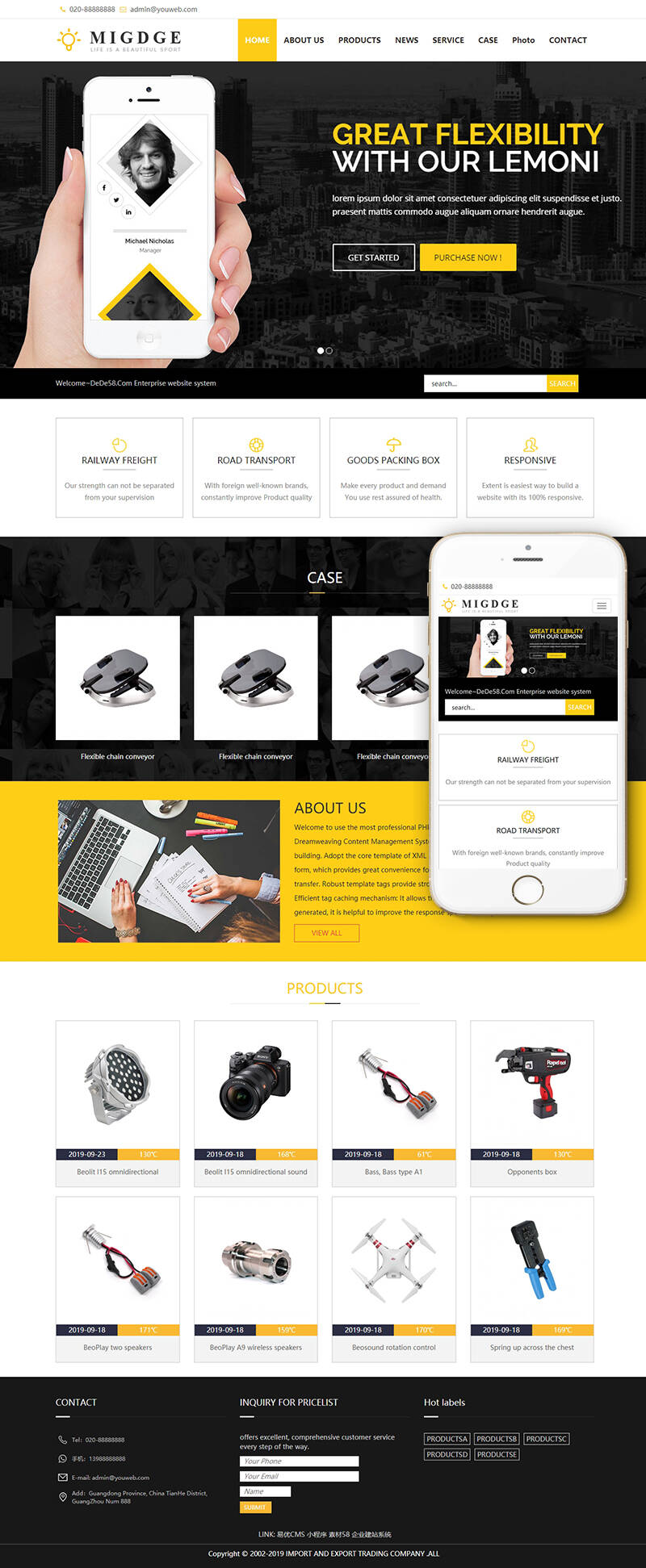 织梦最新内核开发的模板,该模板属于企业通用类、五金、电器、出口、英文、外贸类企业都可使用,这款模板使用范围极广,不仅仅局限于一类型的企业,你只需要把图片和产品内容;换成你的,颜色都可以修改,改完让你耳目一新的感觉!响应式自适应设计,同一个后台,数据即时同步,简单适用!