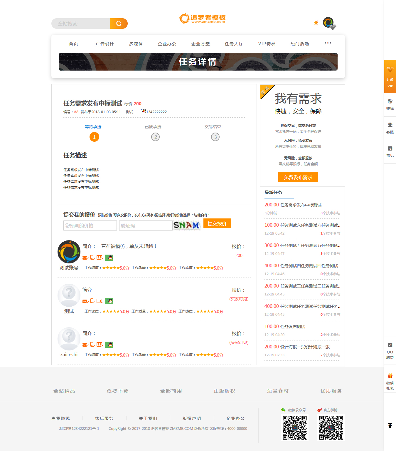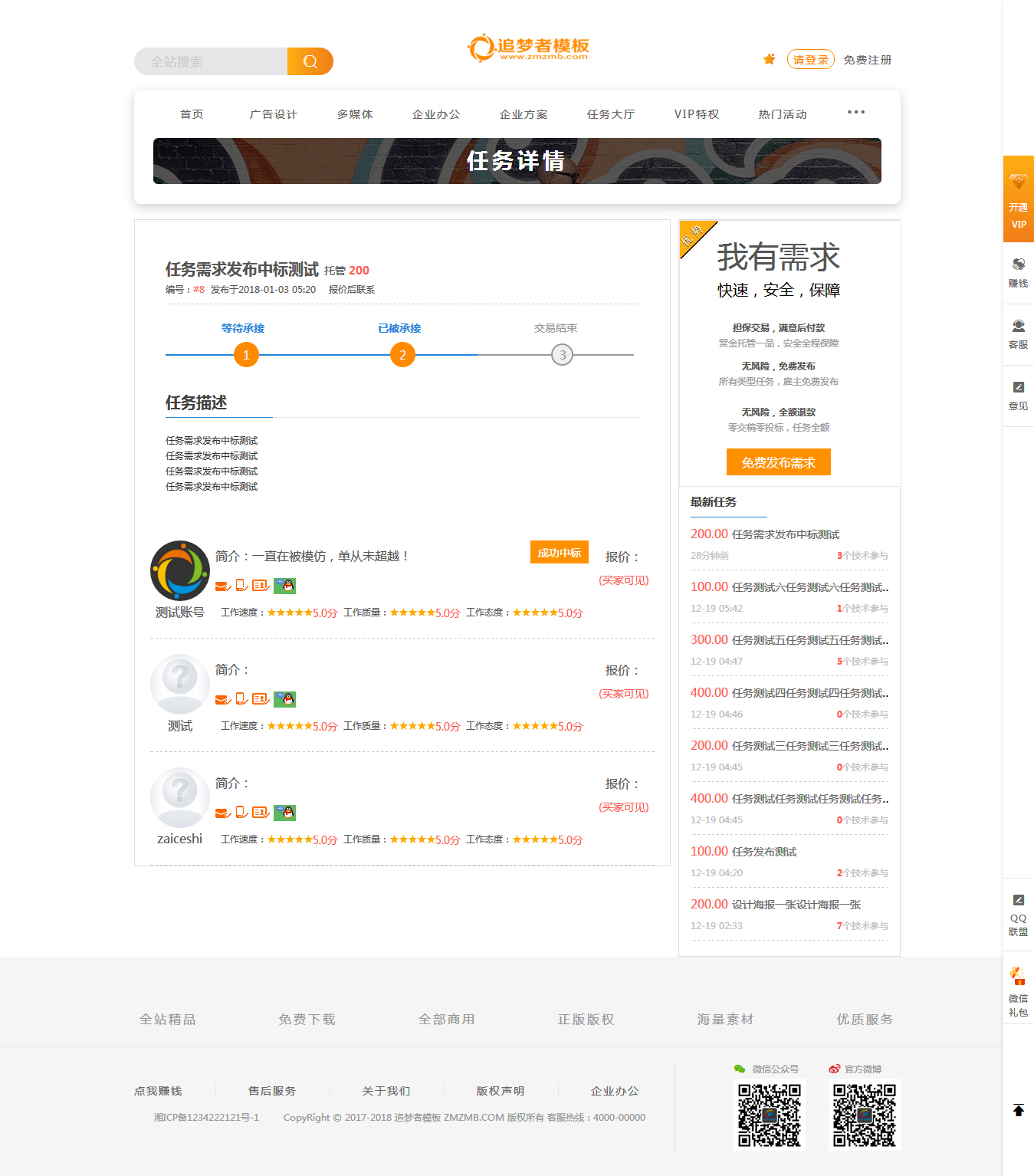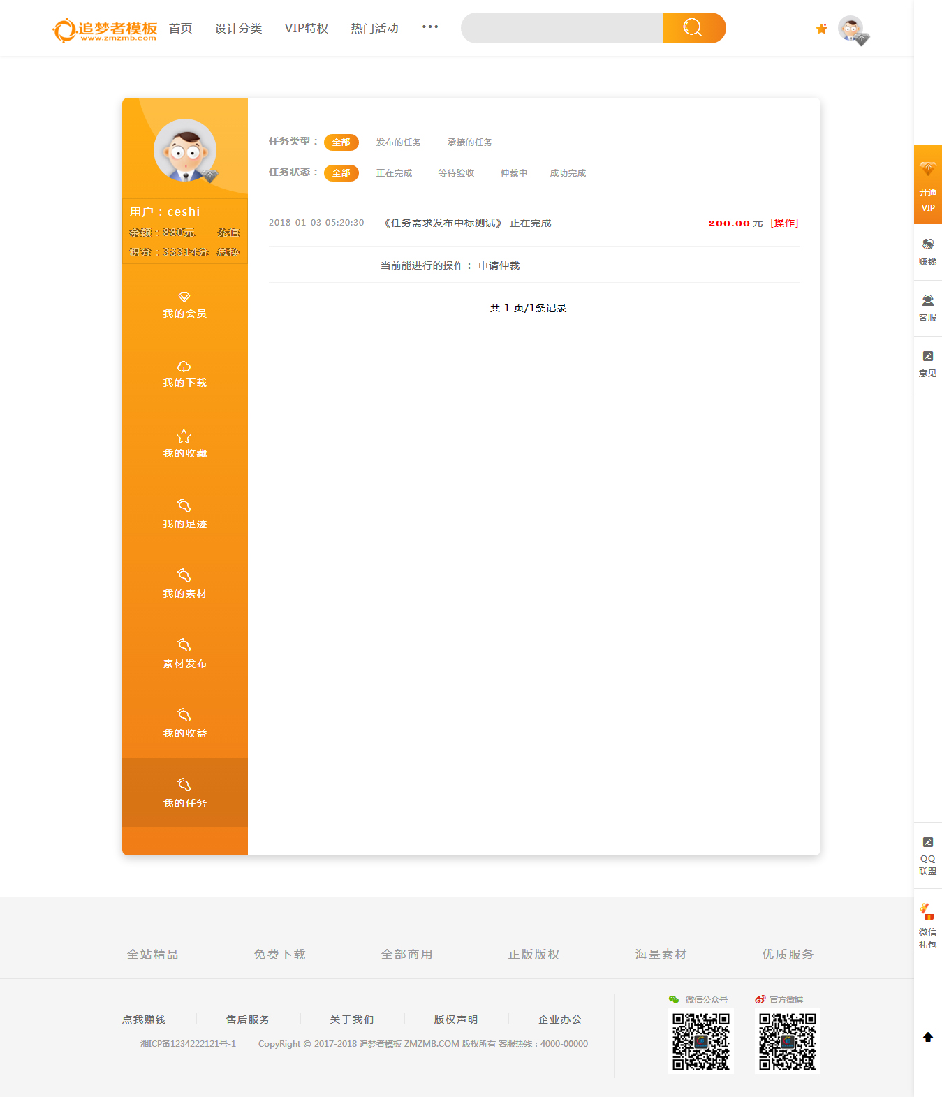 精仿包图网,在此基础上进一步优化修改并增加了手机验证,设计师认证并作品发布,作品收益和威客需求任务获得的钱可以直接提现。集成了QQ和微信登录以及支付宝和微信付款充值账户。废话不多说是本人良心之作,模板好不好请直接看截图演示。。