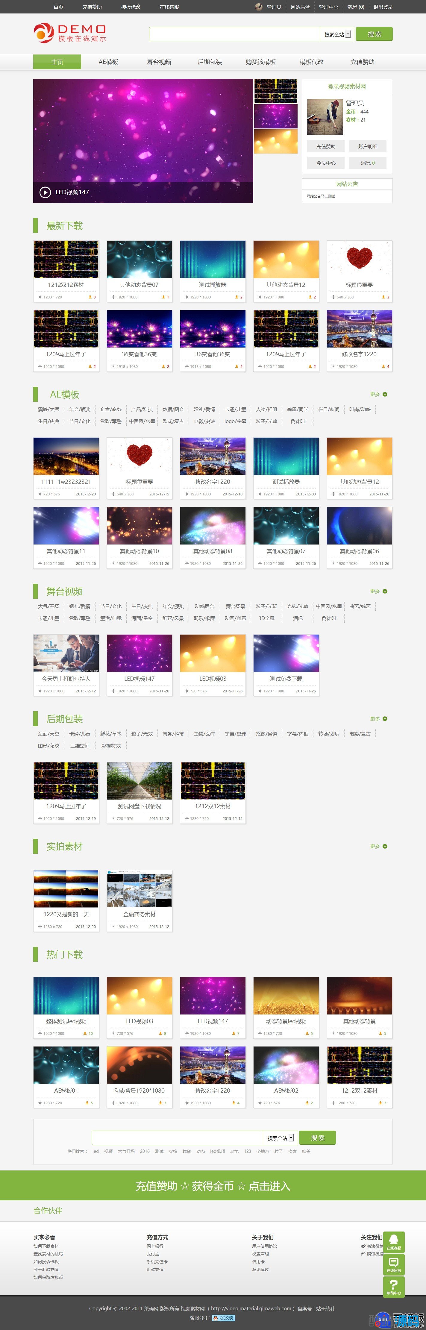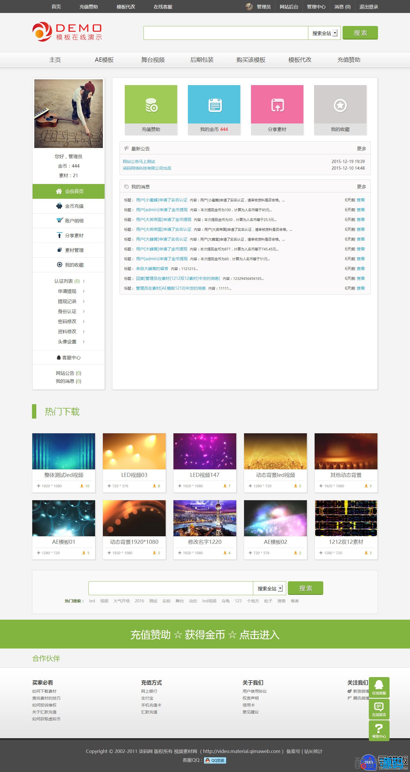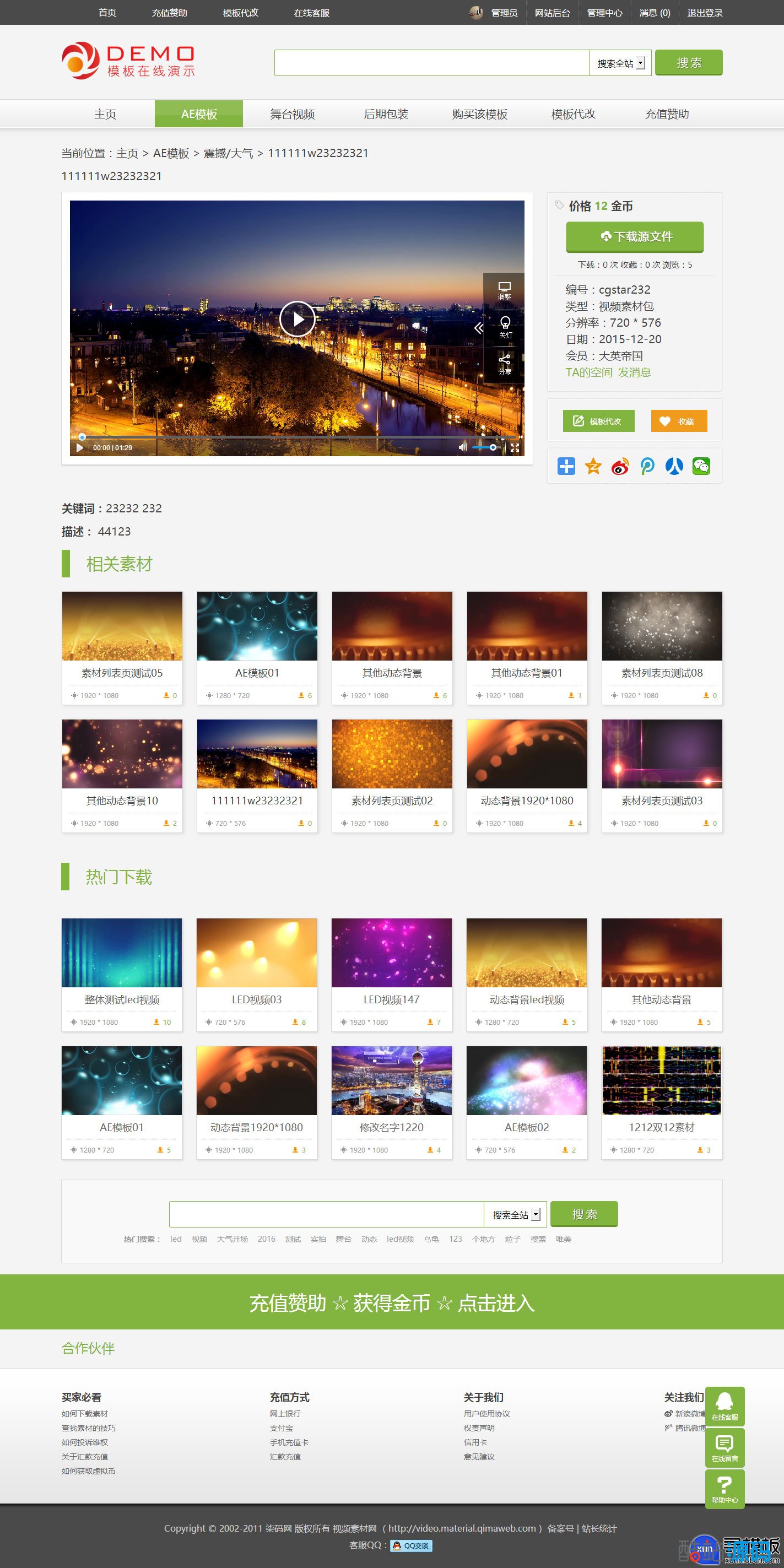 1,模板包括首页、素材列表页、素材详情页、素材下载地址页、文章列表页、文章内容页、文章封面页、用户中心(登录、注册、找回密码、用户中心首页、金币充值、上传素材、素材管理、收藏夹、资料修改、身份认证、申请提现等),代码书写规范,干净整洁。