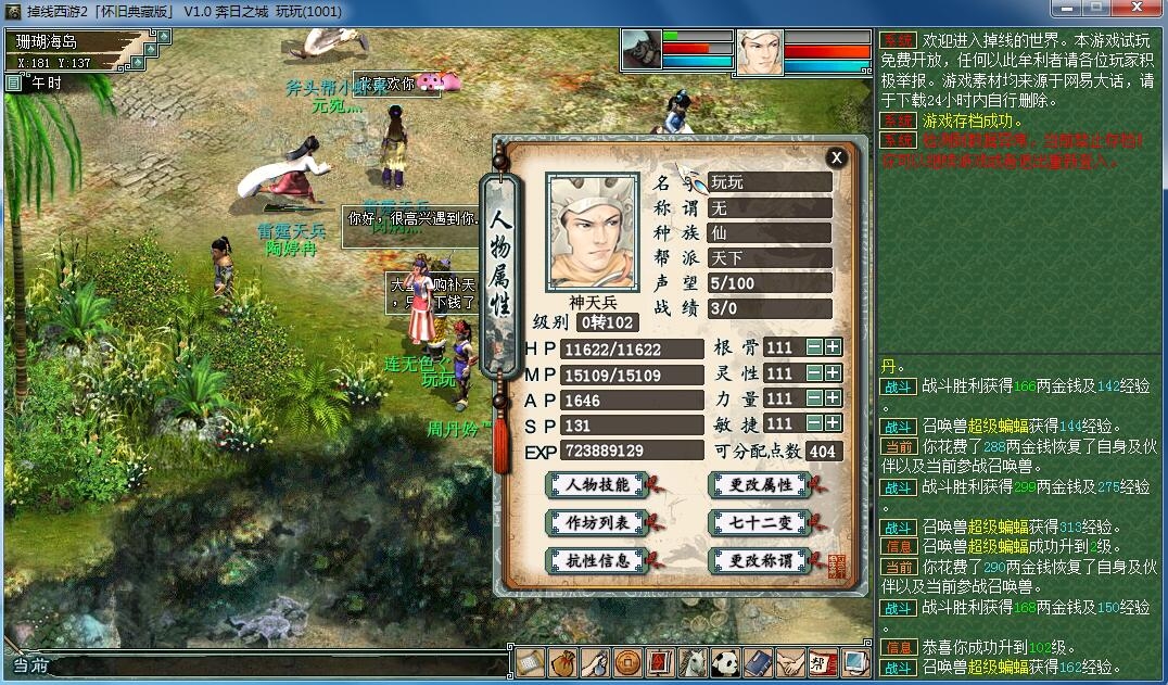 这个单机大话西游是怀旧版的,没有鬼族,没有鬼族,没有鬼族,有神兵和仙器,坐骑有1-6座,活动都有杀星,三界妖王,猜灯谜,天女散花(可以捡到神兵仙器,看脸的),帮派任务,经典200环,小鬼,做天,鬼王,修罗,剧情称谓,挖宝,洛阳赌坊赌博,神兽飞升,变身卡,长安和洛阳集市会有野人摆摊,随机会出一些好东西,仙器升级同官方,此游戏需要在渔村砍到10级,然后去长安过1称。1-10称都跟官方一样,此单机版本需要5开,开局就送老版神兽蝙蝠,也可组野人,方法均是10级后,击杀剧情中后,给袁天罡指定药品后开启组队系统。具体打开就明白了,都在剧情任务提示中。 野人50级会放5法, 组队范围是人物等级±5级,所以理论上45级就可以组4个50级的野人进行升级。野人的人物属性点,召唤兽属性点均为随机加点,你无法控制,所以1转后野人会非常废柴,建议在人物可以做天的情况下带小伙伴(五开)进行游戏。40级可以做师门练法,50级前可以帮派,地图10分钟概率出现灯谜,可参加,加速升级效率,也可以安排暗雷打野。50级开始抓鬼会更有效率,领双,在线20小时给8小时双倍。每20小时重置双倍。 抓鬼都有保底奖励,至于是什么需要你们自己测试,最高奖励神兵。游戏东西全靠掉落,妖王10分钟概率刷1-3个, 星30分钟概率刷1-2个1-15级随机,需要按阶击杀。其它的探索着玩吧,此游戏就是特别特别的耗时间,很肝要一级一级的砍怪做任务升级,因为水平有限不会修改数据,用CE一修改就不能保存数据了,你们自己摸索吧,哪位大神会修改数据可以教我一下。