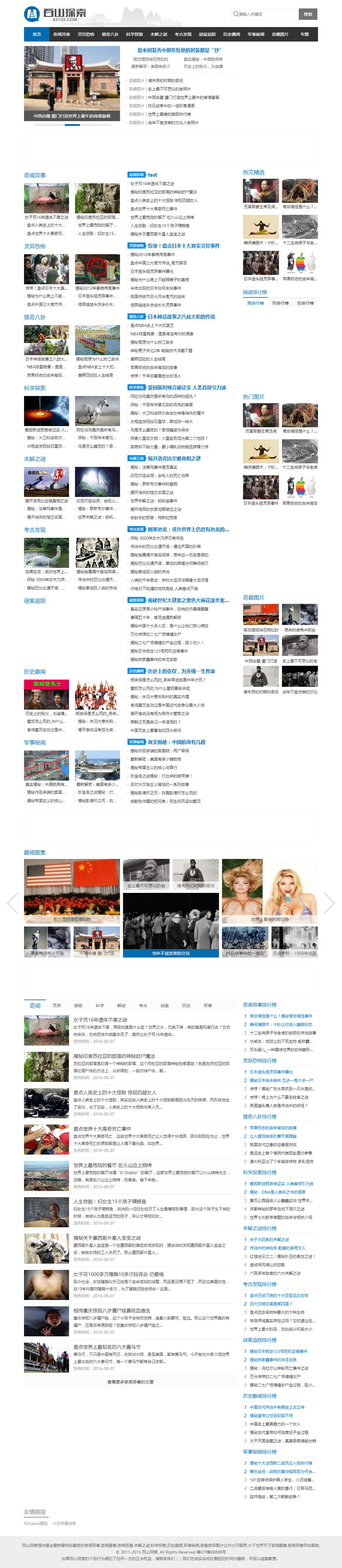 源码经过小贝壳仔细认真的修正,修复几个原始数据的错误问题,保证100%可用,此套源码已经完美破解。此套帝国CMS7.2模板包括奇闻异事,灵异恐怖,猎奇八卦,科学探索,未接之谜,考古发现,迷案追踪,历史趣闻等不同的栏目。信息主要是关于奇闻异事的,比较容易产生深度浏览,从而提高SEO排名。