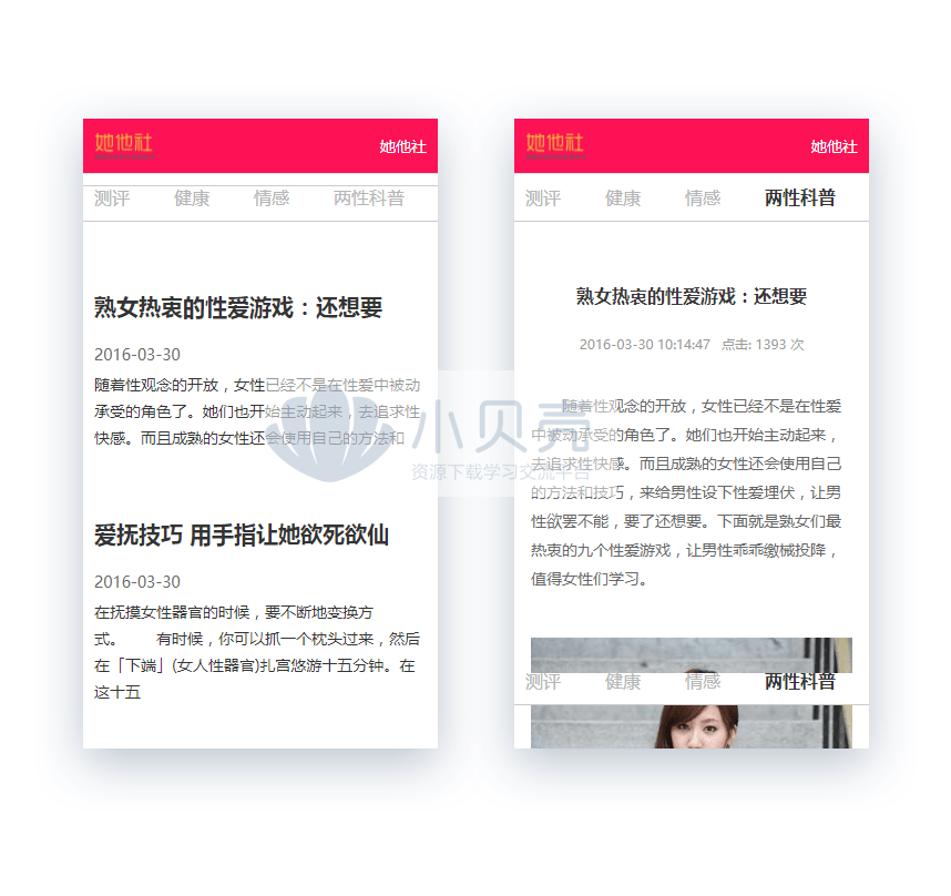 帝国CMS7.2仿她他社网站 响应式情趣情感博客类网站模板源码+带手机版