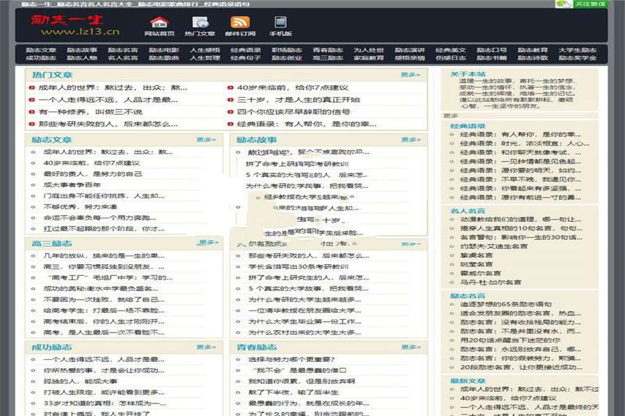 励志名言、励志电影、励志歌曲、励志文章、励志故事、励志书籍、励志演讲、励志创业、名人名言、经典语录、人生感悟、伤感日志、经典台词、励志电视剧、励志人物、励志英语、励志签名、励志诗歌、励志口号、职场励志、成功励志、高三励志、青春励志、感恩励志、为人处世、读后感、观后感、大学生励志、励志教育、家庭教育。